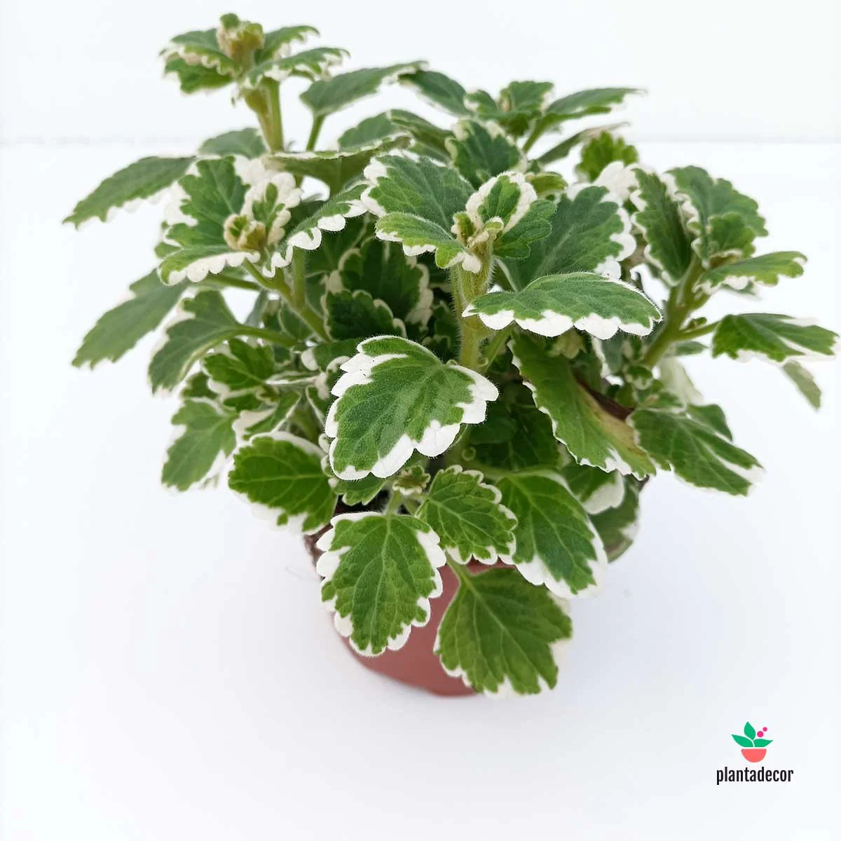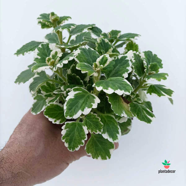 El Plectranthus forsteri ‘Marginatus’ es una planta aromática y decorativa, de crecimiento rápido y porte colgante o rastrero. Sus hojas redondeadas, carnosas y suavemente dentadas presentan un atractivo color verde medio con bordes blancos o crema, lo que le aporta un efecto luminoso y elegante en macetas, jardineras o cestas colgantes.